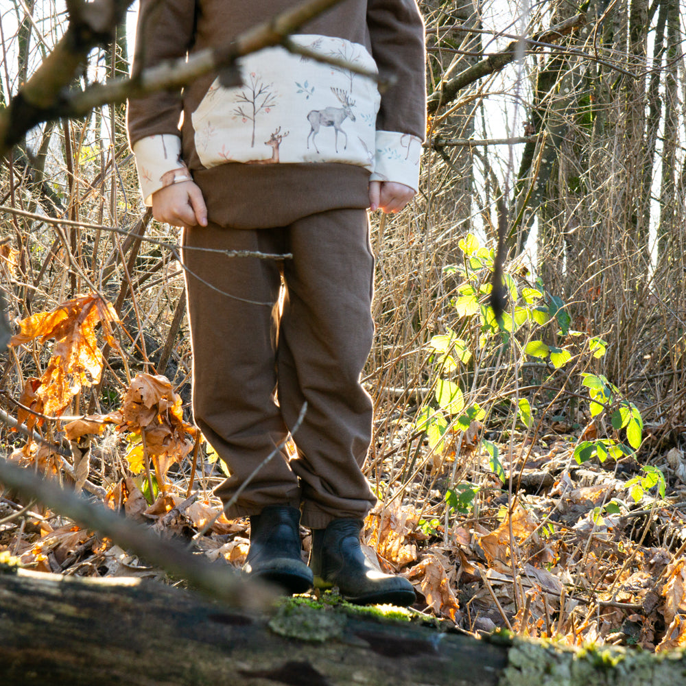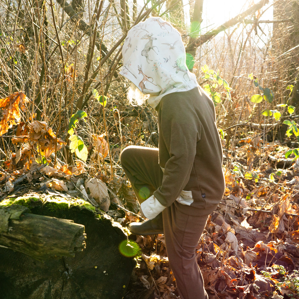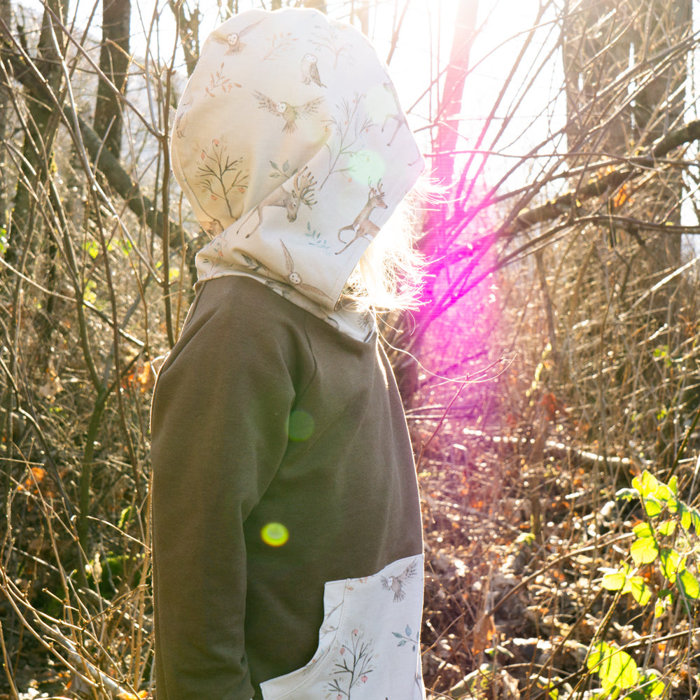 Each design is hand painted by artists from across North America and beyond. Each selection is printed onto organic cotton using a printer in the USA, and then shipped to my door, where I hand sew the latest releases. This season, the various long sleeve tops pair perfectly with any of the new designs, allowing you to mix/match and build a little capsule for the little one in your life.